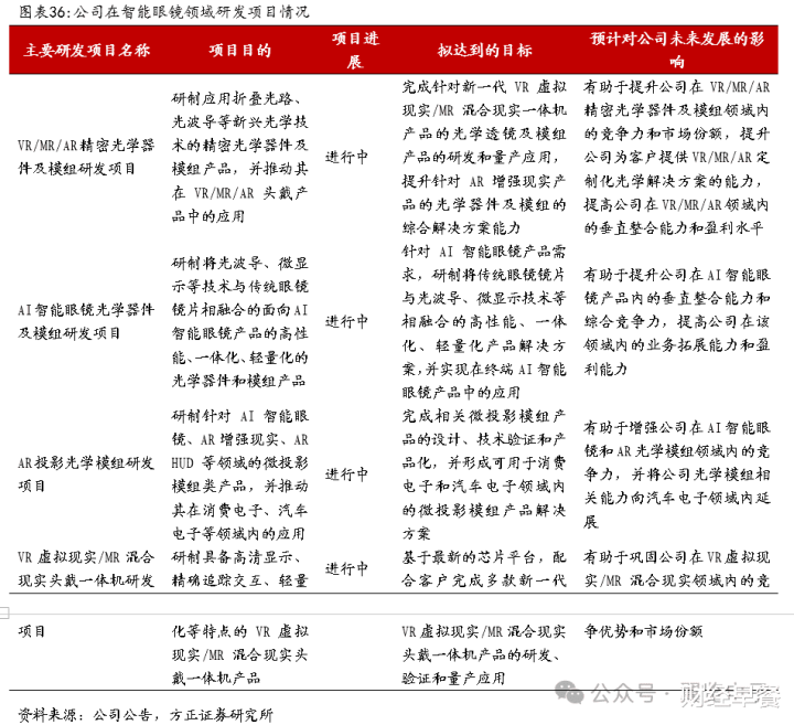 据方正证券整理,公司深度绑定索尼、Meta、亚马逊、谷歌、小米等全球领先科技大厂,为国内外各大品牌独家代工AI+XR眼镜产品,还与高通合作开发基于骁龙XR1/XR2平台的全新参考设计平台,与WaveOptics签订协议独家生产供应光波导元件,为后续导入其他科技巨头奠定基础。下面这张图表,总结了目前歌尔股份在智能眼镜方面的研发进展: